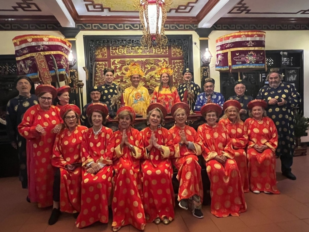 Después de descansar en el hotel nos dirigimos al restaurante Cung Dinh, una de las cenas más simpáticas del viaje, donde el grupo ataviado de vestidos vietnamitas degustó camarones fritos, carne a la parilla y pescado al vapor, entre otros.